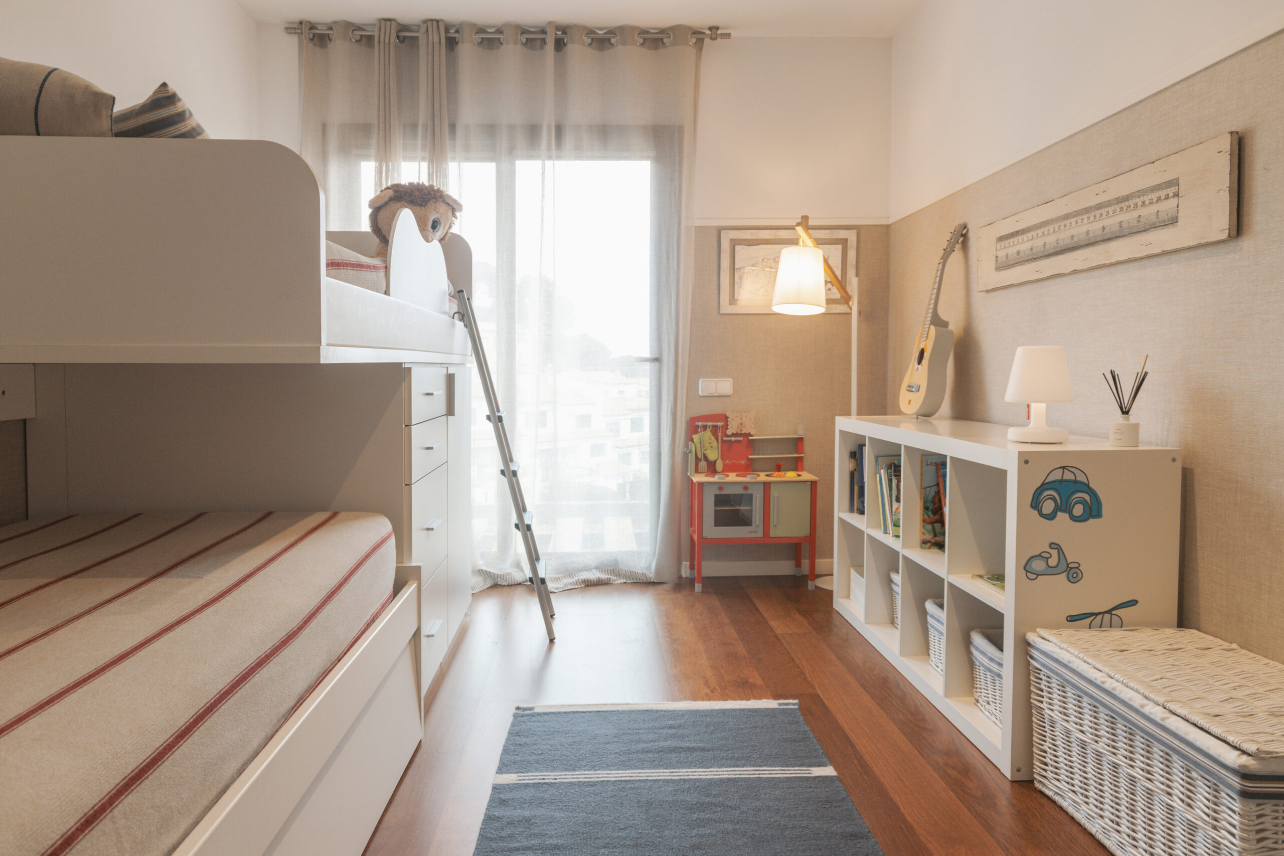 Con literas resistentes y bien distribuidas, esta habitación es ideal para niños mayores o adolescentes que comparten espacio.